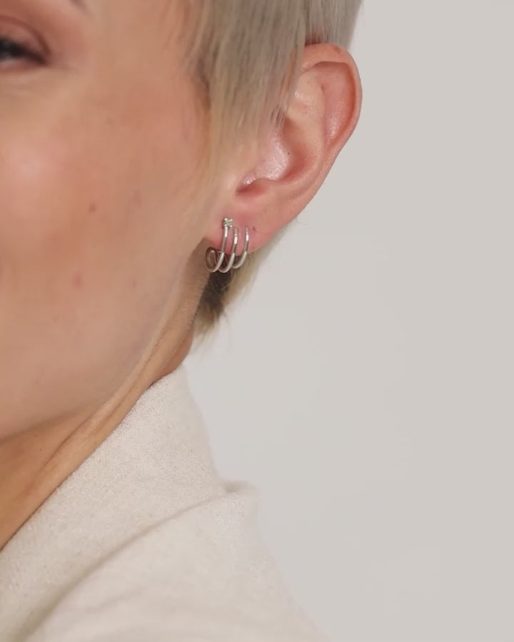 Die Trine Huggies haben eine einzigartige Umarmungsstruktur mit drei Metallreifen, die gleichzeitig dein Ohr umschließen und mit einem zarten Edelstein verziert sind. Dieses Design erzeugt eine optische Täuschung, sodass es aussieht, als würdest du drei separate Ohrringe tragen, obwohl es tatsächlich nur einer ist. Gefertigt mit einem fair gehandelten Amethyst.